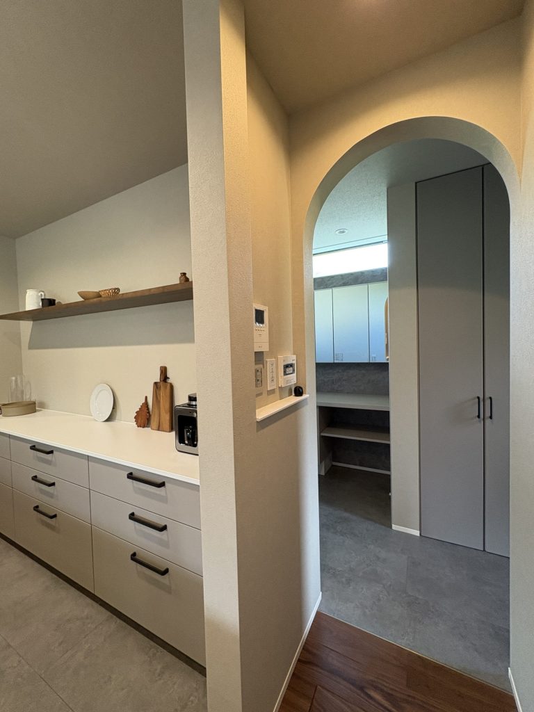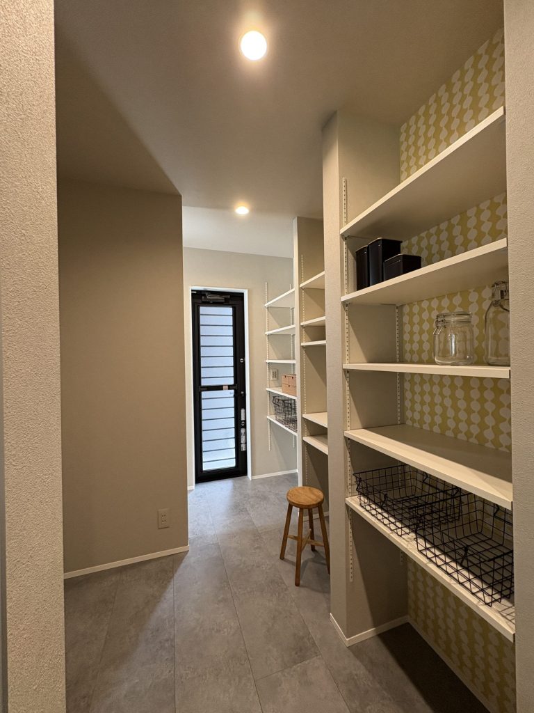 みっつめの動線は駐車場からすぐのところにある勝手口からパントリー・冷蔵庫~キッチンへ。