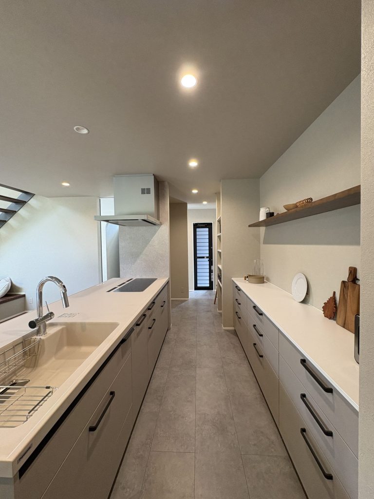 キッチンはフロントオープンの食洗器を採用し、食器棚の引き出しを空いた状態にすると最短距離で食器を片付けられ、家事時短になるのが嬉しい配置です。