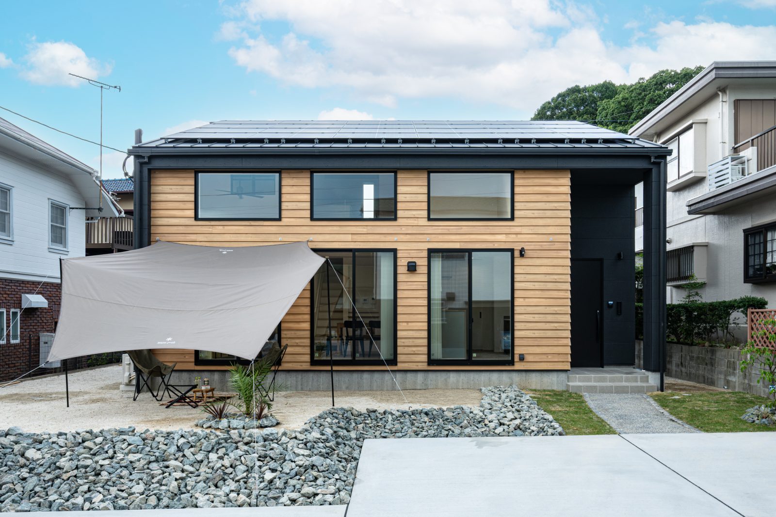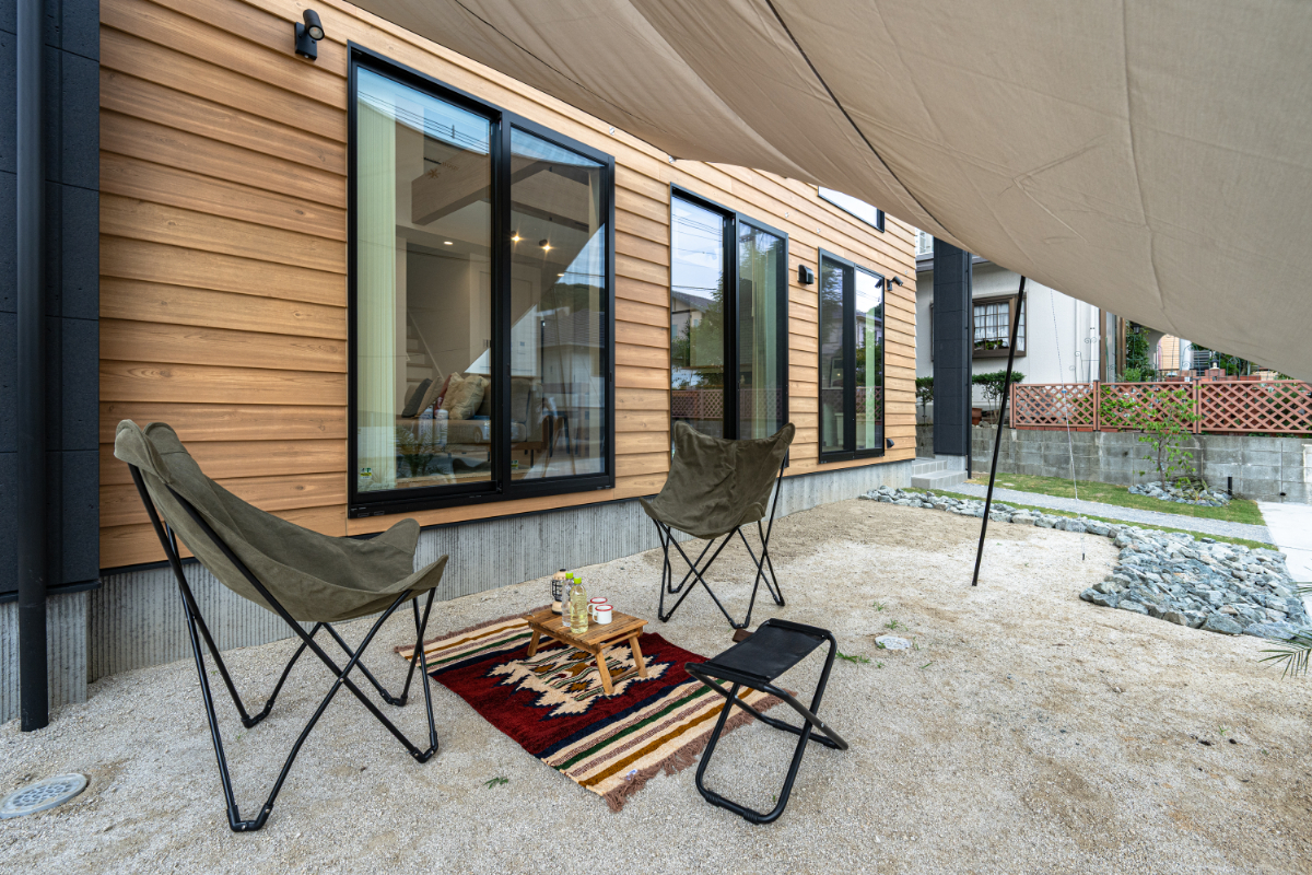 印象的な木の外壁にブラックを効かせた、ナチュラルかっこいい外観デザイン。 アウトドア気分を味わえるロックガーデンの庭が外観とマッチしています。 LDKは大きな吹抜けにして、2階部分の窓からも自然の光が差し込む明るく開放的な空間に仕上げています。 北欧風のキッチンはアイランド型で使い勝手も抜群。 1階に寝室としても使える洋室、2階には3部屋を用意。 家族分の衣服などを仕舞えるファミリークローゼットは、1人1人管理できるように仕切りや棚を造り付けています。
