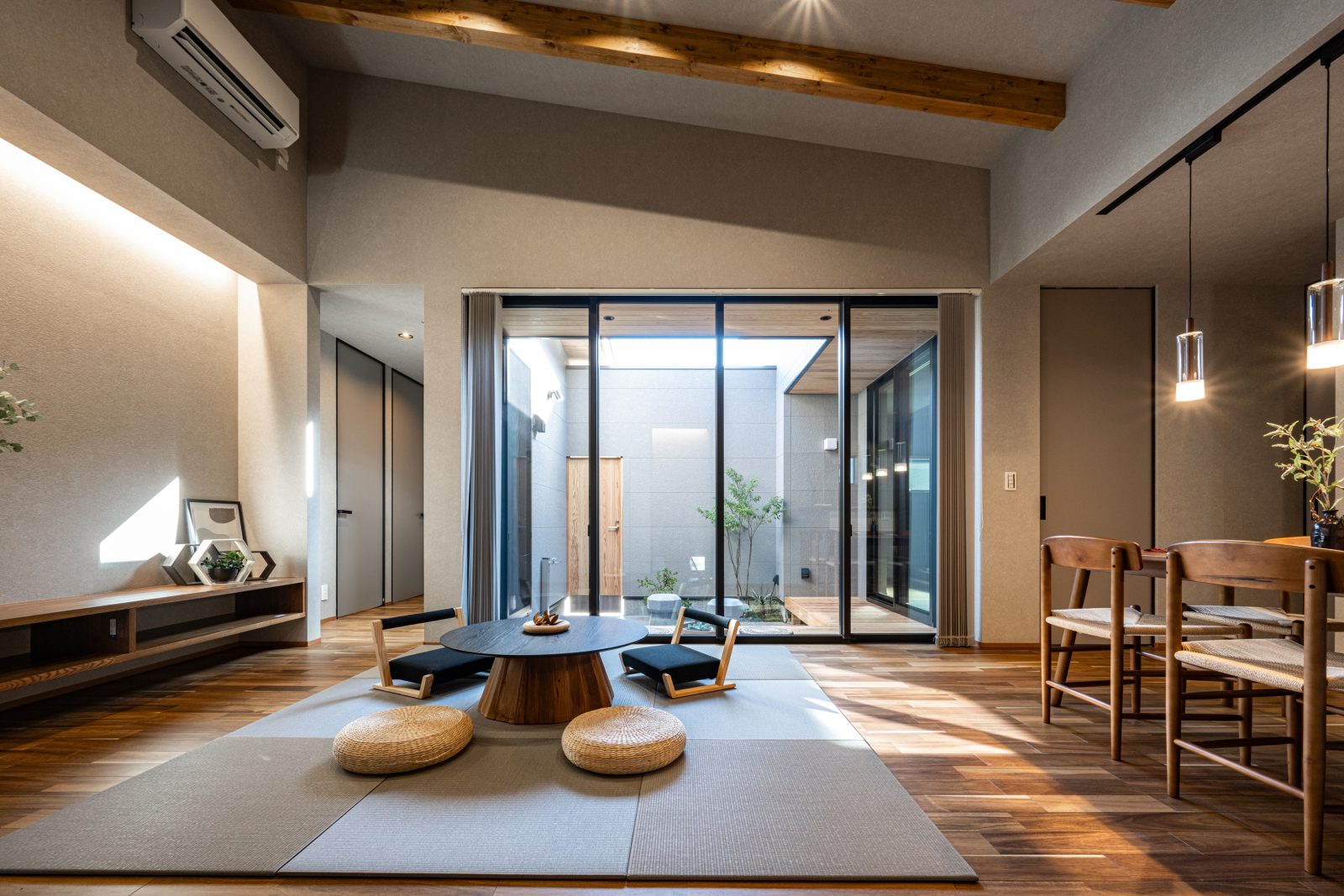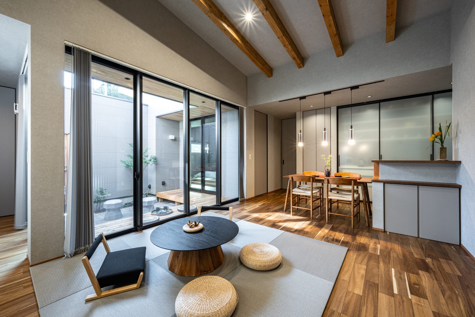 畳リビングは中庭と繋がり、周囲の目線を気にすることなく自然の光と風が舞い込むので、 一日中カーテンを閉めず開放的に過ごせます。